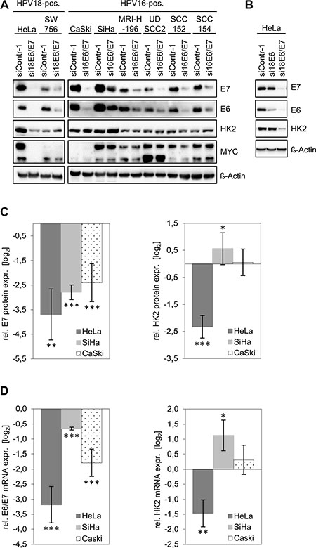 Figure 1: HK2 and MYC levels in HPV-positive cancer cells upon silencing of endogenous E6/E7 expression. (A) Immunoblot analyses. HPV E6/E7 expression was silenced by RNAi in HPV18-positive (HeLa, SW756) and HPV16-positive (CaSki, SiHa, MRIH196) cervical cancer cells and in HPV16-positive (UDSCC2, SCC152, SCC154) HNSCC cells. E7, E6, HK2 and MYC protein levels were determined. siContr-1, control siRNA. β-Actin, loading control. (B) Immunoblot analyses. Endogenous HPV18 E6 or E6/E7 expression were silenced in HeLa cells by RNAi. Indicated are E7, E6 and HK2 protein levels. siContr-1, control siRNA. β-Actin, loading control. (C) Quantitative analyses of HK2 protein levels upon E6/E7 silencing. Data is derived from multiple independent experiments in HeLa (n = 5), SiHa (n = 11) and CaSki (n = 6) cells and was quantified by densitometric scanning. For each cell line, relative protein levels are indicated (log2 display), compared with control-siRNA-transfected cells. Left panel: E7 protein expression, right panel: HK2 protein expression levels. Standard deviations are depicted. (D) Accompanying qRT-PCR analyses of HK2 transcript levels (right panel) upon E6/E7 silencing (left panel). Values (log2 display) are derived from multiple independent experiments in HeLa (n = 5), SiHa (n = 11) and CaSki (n = 6) cells, and are indicated relative to control-siRNA-transfected cells.