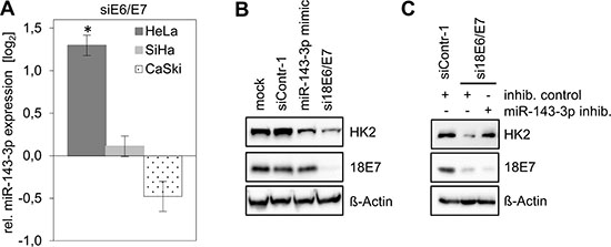 Figure 3: HK2 levels in HeLa cells depend on E6/E7-linked repression of miR-143-3p expression. (A) Analyses of miR-143-3p levels in HeLa, SiHa and CaSki cells upon silencing of viral E6/E7 expression by RNAi. Indicated are changes of relative miRNA levels upon transfection of E6/E7-targeting siRNAs (siE6/E7; i.e. si18E6/E7 in HeLa or si16E6/E7 in SiHa and CaSki cells) compared with control-siRNA (siContr-1)-transfected cells (log2 display). Data is derived from 3 (HeLa), 4 (SiHa) and 4 (CaSki) independent analyses, respectively. Standard deviations are depicted. (B) Immunoblot analysis of HK2 and HPV18 E7 protein levels in HeLa cells following transfection with siContr-1, with a synthetic miR-143-3p mimic or with si18E6/E7, respectively. Mock control, treatment with the transfection agent only. (C) Immunoblot analysis of HeLa cells transfected with si18E6/E7 or control siRNA siContr-1. In addition, cells were co-transfected with miR-143-3p inhib. or inhib. control, as indicated. HK2 and HPV18 E7 protein levels are illustrated. β-Actin, loading control.