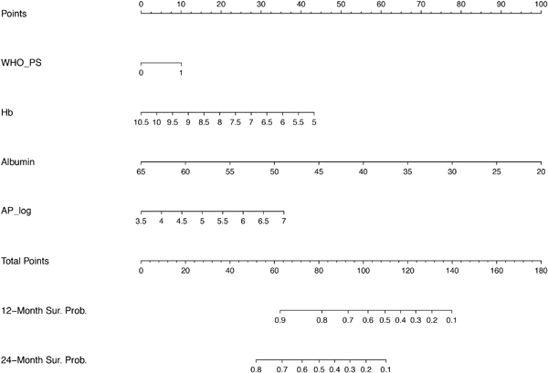 Figure 1 presents a nomogram that is based on the multivariable model for OS. This nomogram can be used to predict the individual survival probability at 12 and 24 months. For example, a patient with a performance score of 1, an Hb level of 7.0 mmol/L, albumin level of 40 g/L and AP of 90 U/L (log_AP = 4,5) has a 12 month survival probability of approximately 60% and a 24 month survival probability of approximately 20%.