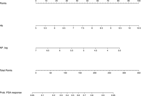 Figure 2: Nomogram for PSA response. Prognostic nomogram predicting PSA response. For both variables, Hb and AP_log, draw a vertical line from the absolute value of this variable up to the ‘Points’ axis (top line) to identify the number of prognostic points the patient receives for these variables. Calculate the ‘Total Points’ by adding up the prognostic points for both variables. Determine the probability of PSA response by drawing a vertival line form the ‘Total Points’ axis down to the axis of the probability of PSA response. Hb = hemoglobin, AP = alkaline phosphatase, log = log transformed variables when data were not normally distributed.