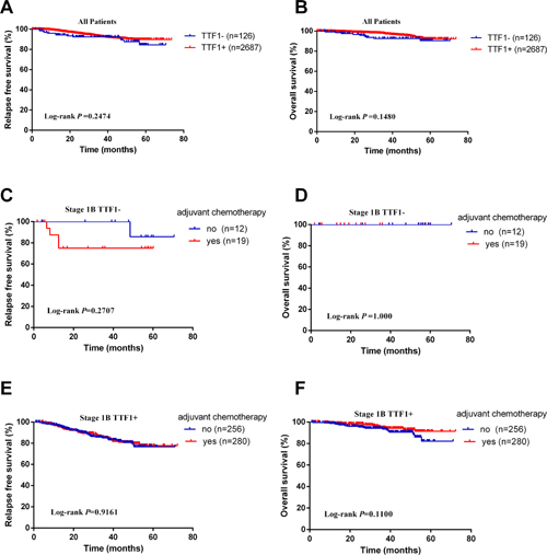 Figure 1: Kaplan–Meier survival curves for recurrence-free survival (RFS) and overall survival (OS) according to TTF-1 status. (A) RFS in all patients. (B) OS in all patients. (C) RFS in stage IB TTF-1− patients. (D) OS in stage IB TTF-1− patients. (E) RFS in stage IB TTF-1+ patients. (F) OS in stage IB TTF-1+ patients.