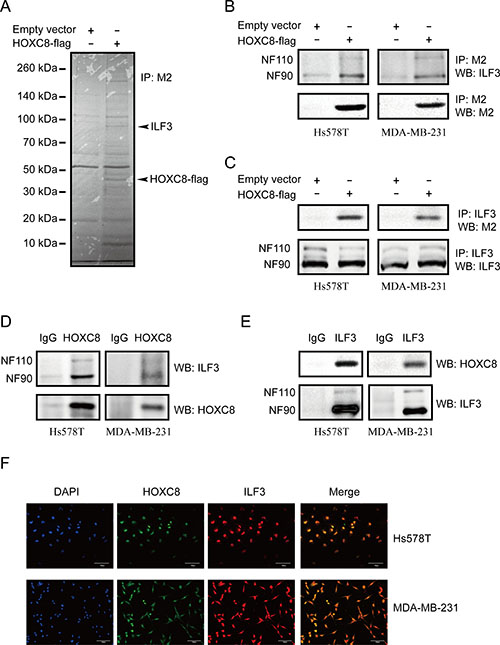 Figure 1: ILF3 interacts with HOXC8 in breast cancer cells. (A) MDA-MB-231 cells were lentivirally transduced with the empty vector or vector encoding HOXC8-flag. Co-immunoprecipitations performed with the anti-flag M2 antibody were separated by SDS–PAGE, and the differential bands were analyzed by MS. (B) Co-immunoprecipitation (Co-IP) was performed using the M2 antibody in Hs578T or MDA-MB-231 cells that were lentivirally transduced with the empty vector or vector encoding HOXC8-flag. Immunoprecipitates were analyzed by Western blotting (WB). (C) Co-IP was performed using the ILF3 antibody in Hs578T or MDA-MB-231 cells that were lentivirally transduced with the empty vector or vector encoding HOXC8-flag. Immunoprecipitates were analyzed by WB. (D) Co-IP experiment was performed using anti-HOXC8 antibody in Hs578T or MDA-MB-231 cells, and precipitated proteins were analyzed by WB using anti-ILF3 or anti-HOXC8 antibodies as indicated. (E) Co-IP experiment was performed using anti-ILF3 antibody in Hs578T or MDA-MB-231 cells, and precipitated proteins were analyzed by WB using anti-HOXC8 or ILF3 antibodies as indicated. (F) Immunofluorescence staining for HOXC8-flag (green) and ILF3 (red) in Hs578T or MDA-MB-231 cells that were lentivirally transduced with the vector encoding HOXC8-flag; DAPI staining for the nucleus. Magnification, 200×; Scale bar, 100 μm.