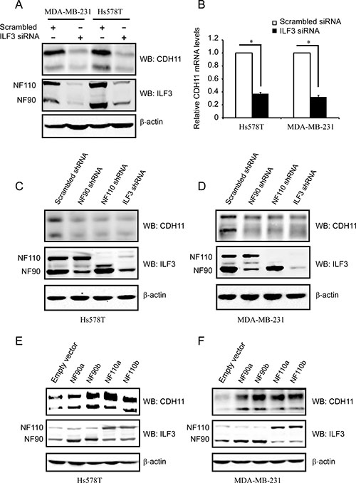 Figure 2: ILF3 activates CDH11 expression in the Hs578T and MDA-MB-231 cell lines. (A) Hs578T and MDA-MB-231 cells were transfected with siRNAs that specifically targeted ILF3 or with scrambled siRNAs. Cell lysates were immunoblotted for CDH11, ILF3 and β-actin, as indicated. (B) Hs578T and MDA-MB-231 cells were transfected with siRNAs that specifically targeted ILF3 or with scrambled siRNAs. Total RNA was subjected to qRT-PCR to examine the levels of CDH11 mRNA. β-actin mRNA was used as an internal control for standardization. (C and D) Hs578T or MDA-MB-231 cells were lentivirally transduced with NF90-, NF110- or ILF3-specific shRNA, and Western blotting was performed with antibodies for CDH11, ILF3 or β-actin, as indicated. (E and F) Hs578T or MDA-MB-231 cells were lentivirally transduced with NF90a, NF90b, NF110a or NF110b expression vectors, and Western blotting was performed with antibodies for CDH11, ILF3 or β-actin, as indicated.