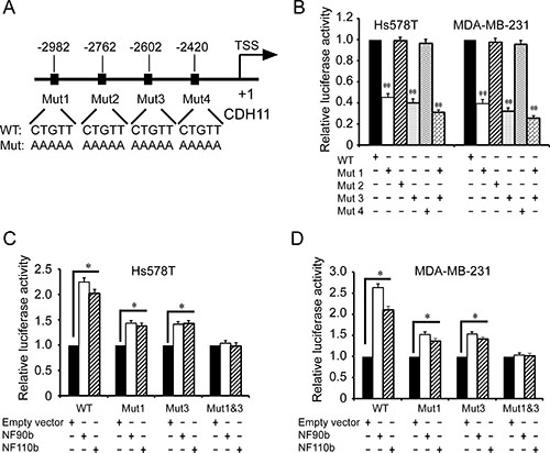 Figure 4: Identification of the ILF3 binding sites in the CDH11 promoter by mutagenesis. (A) A schematic diagram for the mutagenesis of four CTGTT (putative ILF3 binding) sites in the CDH11 promoter. (B) Luciferase analyses were performed with wild-type (WT) or mutant (Mut) CDH11 promoter luciferase reporter vectors in Hs578T or MDA-MB-231 cells. The luciferase activity was measured and normalized to the Renilla activity. Columns, mean; bars, SEM; **P < 0.01. (C and D) Hs578T or MDA-MB-231 cells were lentivirally transduced with NF90b, NF110b expression vectors or the empty vectors and then transfected with mutant (Mut) CDH11 promoter luciferase reporter vectors, as indicated. The luciferase activity was measured and normalized to the Renilla activity. Each sample was run in triplicate and in multiple experiments for mean ± SEM; *P < 0.05; **P < 0.01.
