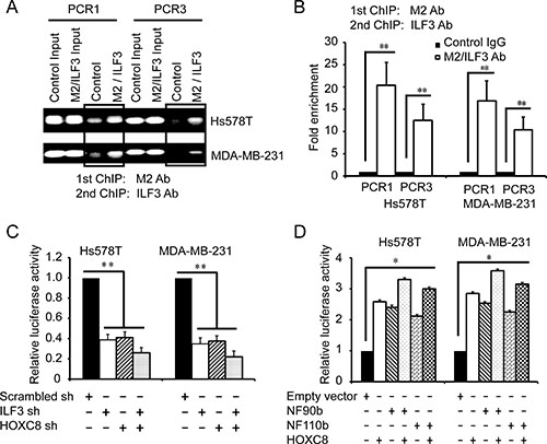 Figure 5: ILF3 and HOXC8 co-occupy the CDH11 promoter to activate CDH11 transcription. (A and B) Sequential ChIP assays were performed in Hs578T or MDA-MB-231 cells that were lentivirally transduced with HOXC8-flag expression vectors. Chromatin was incubated with the anti-flag M2 antibody, and the immunocomplexes were subjected to a second round of ChIP using antibodies against ILF3 or with rabbit IgG as the control. Precipitated chromatin DNA was subjected to PCR or real-time PCR. (C) Cells were lentivirally transduced with ILF3 shRNA, HOXC8 shRNA or scrambled shRNA vectors as indicated and transfected with CDH11 promoter luciferase reporter plasmids. The luciferase activity was measured and normalized to the Renilla activity. (D) Cells were lentivirally transduced with vectors encoding NF90b, NF110b or HOXC8 and transfected with CDH11 promoter luciferase reporter plasmids. The luciferase activity was measured and normalized to the Renilla activity. Each sample was run in triplicate and in multiple experiments for mean ± SEM; *P < 0.05; **P < 0.01.