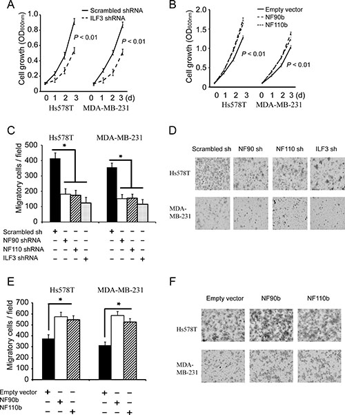 Figure 6: ILF3 promotes proliferation and migration breast cancer cells. (A) MTT assays to analyze cell proliferation of control, or ILF3 knockdown cells. Data are the mean ± SEM; n = 3; P < 0.01. (B) MTT assays were carried out in cells that were lentivirally transduced with empty vectors or vectors encoding NF90b or NF110b. Data are the mean ± SEM; n = 3; P < 0.01. (C and D) Transwell assays to analyze cell migration of control, NF90, NF110 or ILF3 knockdown cells. Columns, mean; bars, SEM; n = 3; *P < 0.05. (E and F) Transwell assays to analyze migration of cells that were lentivirally transduced with empty vectors or vectors encoding NF90b or NF110b. Columns, mean; bars, n = 3; SEM; *P < 0.05.