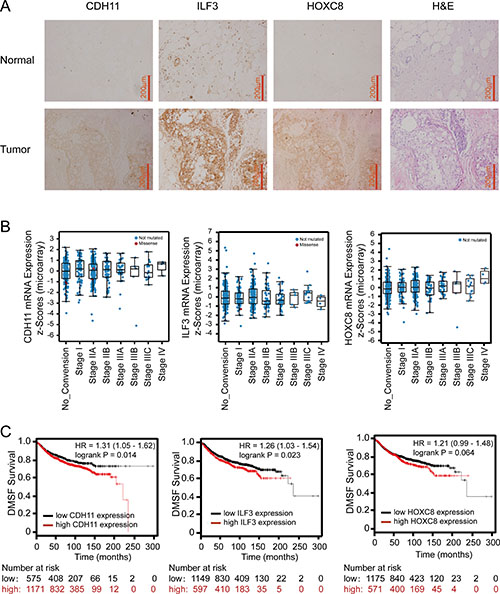 Figure 8: Immunohistochemistry of ILF3, CDH11 and HOXC8 in breast cancer specimens and analyses of ILF3, CDH11 and HOXC8 expression using publicly available datasets. (A) IHC staining of CDH11, ILF3 and HOXC8 in normal breast and breast cancer tissues. Magnification, 200×; Scale bar, 200 μm. (B) mRNA expression levels of CDH11, ILF3 and HOXC8 in breast cancer specimens from different disease stages using the breast cancer dataset (Breast invasive carcinoma, TCGA, Nature 2012, 825 samples) from cBioPortal (www.cbioportal.org). (C) Kaplan-Meier survival plots show distant metastasis-free survival for breast cancer patients with high and low expression of CDH11, ILF3 or HOXC8. Data were analyzed using an online survival analysis tool (www.kmplot.com, probe ID: 217804_s_at for ILF3, 207173_x_at for CDH11 and 221350_at for HOXC8).