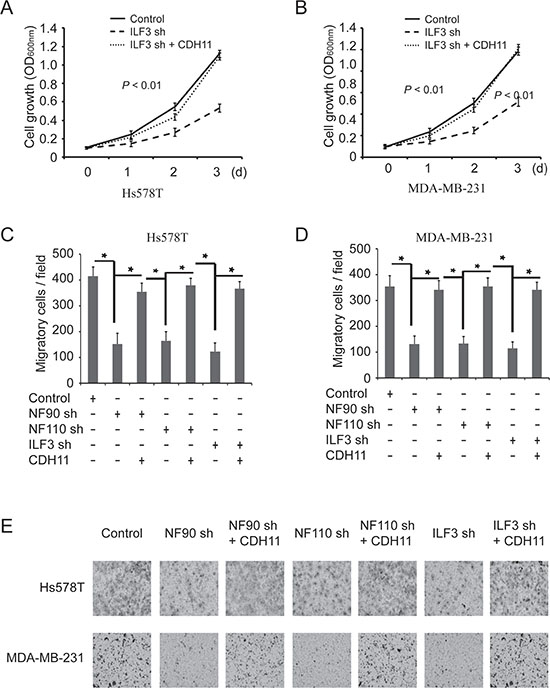 Figure 7: The effects of ILF3 knockdown on cell proliferation and migration are rescued by ecto-expression of CDH11 in breast cancer cell lines. (A and B) ILF3 knockdown cells were lentivirally transduced with CDH11 expression vectors, and MTT assays were performed to analyze cell proliferation. Data are the mean ± SEM; n = 3; P < 0.01. (C and D) Hs578T or MDA-MB-231 cells that were transduced with NF90 shRNA, NF110 shRNA or ILF3 shRNA were lentivirally transduced with CDH11 expression vectors, and Transwell assays were performed to analyze cell migration. Columns, mean; bars, SEM; n = 3; *P < 0.05. (E) Representative images of migratory cells that are crystal violet-stained on the undersurface of transwell.