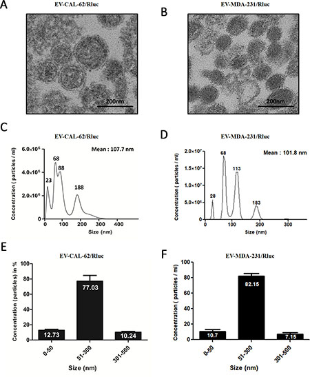 We isolated EVs from the conditioned medium obtained from CAL-62, CAL-62/Rluc, MDA-MB-231 and MDA-MB-231/Rluc cells by ultracentrifugation as described in Current Protocols in Cell Biology [44] with modifications (Figure 1A). The proteins from the isolated EV-CAL-62/Rluc and MDA-MB-231/Rluc (further called as MDA-231/Rluc) were initially analyzed for common EV markers by western blot after ultracentrifugation [45, 46]. Western blotting analysis showed that vesicle trafficking-related protein ALIX and tetraspanin protein CD63, which are frequently identified vesicular proteins, were present (Figure 1B). In contrast, Golgi apparatus (GM130) and endoplasmic reticulum (calnexin) markers were detected in cell lysates but not in EVs, indicating efficient enrichment of EVs from the culture media (Figure 1B). Moreover, we performed further analysis to confirm the shape and size of purified EVs, using transmission electron microscopy (TEM) and NanoSight analysis. The TEM analysis revealed a heterogeneous mixture of vesicles with a diameter ranging from 50 to 450 nm, approximately. The TEM showed predominantly intact vesicles with classical EV morphology. EV preparations showed spherical-shape distributions. (Figure 2A, 2B). NTA yielded a similar vesicle size distribution: from 23 to 500 nm with a mean size of 107.7 nm, from 28 to 450 nm with a mean size of 101.8 nm in EV-CAL-62/Rluc and MDA-231/Rluc respectively (Figure 2C, 2D). The EV size ranging from 51 to 300 nm represented 77% and 82 % of EV-CAL-62/Rluc and MDA-231/Rluc respectively (Figure 2E, 2F). As noted above, both the EVs were successfully isolated and characterized.