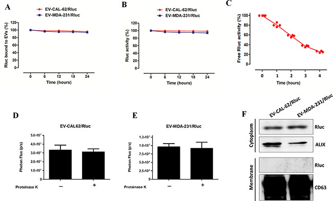 Figure 4: EV-CAL-62/Rluc and EV-MDA-231/Rluc showed high serum stability and Rluc protein incorporated inside the EVs (A) Rluc-binding capacity of EVs in serum. Time course of binding of Rluc in EV-CAL-62/Rluc and EV-MDA-231/Rluc at 37°C in 20% FBS/PBS buffer. Rluc activity was measured in serum. (B) Stability of Rluc activity of EV-CAL-62/Rluc and EV-MDA-231/Rluc in serum. Time course of stability of Rluc in EV at 37°C in 20% FBS/PBS buffer. (C) Stability of Rluc activity of Free Rluc protein in serum. Time course of stability of Rluc at 37°C in 20% FBS/PBS buffer. (D, E) EV-CAL-62/Rluc and EV-MDA-231/Rluc treated with proteinase K and without proteinase K and activity of Rluc was measured by IVIS. Data are expressed as mean ± SD. (F) Western blot analysis of the Rluc protein in cytosolic and membrane fraction of EV-CAL-62/Rluc & EV-MDA-231/Rluc, detected by means of Rluc-specific antibodies. Alix and CD63 served as loading control for cytosolic and membrane fraction respectively.