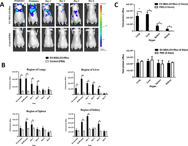 Figure 6: In vivo noninvasive bioluminescent visualization of EV-MDA-231/Rluc biodistribution in nude mice and organ distribution. (A) Representative in vivo bioluminescent imaging (BLI) of EV-CAL-62/Rluc in nude mice. EV-MDA-231/Rluc or PBS (control) was administered via the tail vein. Coelenterazine was injected via the same route at 10 and 30 min and 1, 2, 3, and 6 days after initial administration to visualize EV-CAL-62/Rluc. (B) Quantitation of EV-MDA-231/Rluc signal from regions corresponding to the lung, liver, spleen and kidney after EV administration; the values are expressed as mean ± SD. *P < 0.05 (Student’s t-test). (C) Quantification of dissected organs of mice injected with EV-CAL-62/Rluc (n = 3) or PBS (n = 3). The mice were euthanized at 3 hours and 6 days after injection. Organs were harvested and lysed, and Rluc activity was measured. Bioluminescence quantification of lungs, liver, spleen, and kidneys at 3 hours and 6 days (EV-MDA-231/Rluc or PBS); the values are expressed as mean ± SD, *P < 0.05, (Student’s t-test).