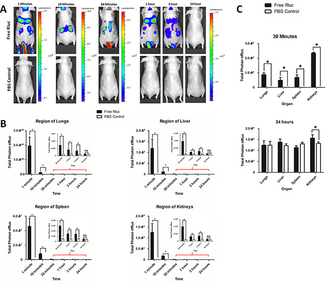 Figure 7: Biodistribution of i.v. administered free Rluc protein in vivo and organ distribution. (A) Representative in vivo bioluminescent imaging (BLI) of mice injected with Free Rluc (n = 3) or PBS (n = 3). Coelenterazine was injected via the same route at 1, 10 and 30 min and 1, 3 and 24 hours after initial administration to visualize free Rluc protein. (B) Quantitation of Free Rluc signal from regions corresponding to the lung, liver, spleen and kidney after EV administration; the values are expressed as mean ± SD. *P < 0.05 (Student’s t-test). (C) Quantification of bioluminescent signals in lungs, liver, spleen, and kidneys at 3 minutes and 24 hours (Free Rluc or PBS). The values are expressed as mean ± SD, *P < 0.05, (Student’s t-test).