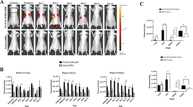 Figure 8: In vivo noninvasive fluorescent visualization of EV-CAL-62/Rluc/DiR biodistribution in nude mice and organ distribution. (A) Representative in vivo fluorescent imaging (FLI) of EV-CAL-62/Rluc/DiR in nude mice. EV-CAL-62/Rluc/DiR or PBS (control) was administered via the tail vein. (B) Quantitation of EV-CAL-62/Rluc/DiR signal from regions corresponding to the lung, liver, and spleen after EV administration; the values are expressed as mean ± SD. *P < 0.05 (Student’s t-test). (C) Quantification of dissected organs of mice injected with EV-CAL-62/Rluc/DiR (n = 3) or PBS (n = 3) mice were euthanized at 3 hours and 12 days after injection. Florescence quantification in lungs, liver, spleen, and kidneys at 3 hours and 12 days (EV-CAL-62/Rluc/DiR or PBS). The values are expressed as mean ± SD, *P < 0.05, (Student’s t-test).