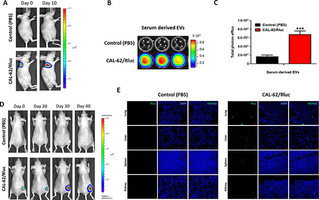 Figure 9: A spontaneous distribution of EV-CAL-62/Rluc in subcutaneous CAL-62/Rluc bearing mice. (A) Representative image of Rluc activity of CAL-62/Rluc or PBS injected nude mice of day 0 and day 20. (B) Activity of Rluc in EVs isolated from the blood serum mice mentioned in (A). (C) Quantification of Serum derived EVs from CAL-62/Rluc (n = 3) or PBS (n = 3) mice. The values are expressed as mean ± SD, *P < 0.05, (Student’s t-test). (D) Representative image of Rluc activity of CAL-62/Rluc or PBS injected nude mice of day 0, 20, 30 and 40. (E) Representative confocal images of Rluc in harvested major organs (lung, liver, spleen and kidney) from mice mentioned in (D) at day 40. Scale bars: 50 μm.