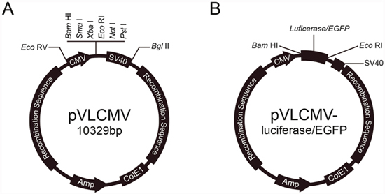 The CMV promoter was PCR-amplified (CMV-F: GGATATCTAGTTATTAATAGTAATCAATTACGG; CMV-R: CGGATCCGGATCTGACGGTTCACTAAACCAGC) from the pEGFP-N3 vector (Invitrogen, Carlsbad, USA) and inserted into the pVL1393 transfer vector (Invitrogen) by EcoRV-BamHI digestion. Meanwhile the polyhedron promoter in pVL1393 was replaced. The SV40 polyadenylation signal was then PCR-amplified (SV40-F: TGCGGCCGCACTGCAGTCATAATCAGCCATACCACATTTGT; SV40-R: GAGATCTACATTGATGAGTTTGGACAAACC) from the pEGFP-N3 vector and inserted into the edited pVL1393 vector downstream of the CMV promoter by NotI-BglII digestion. The CMV promoter and SV40 polyadenylation signals were added to the transfer vector, which was named pVLCMV. The luciferase reporter gene was PCR-amplified (Luc-F: CGGATCCATGGAAGACGCCAAAAAC; Luc-R: GGAATTCTTACACGGCGATCTTTCCGC) from the pGL3 vector (Promega, USA) and subcloned into the pVLCMV vector by EcoRI-BamHI digestion. This reaction produced the luciferase reporter gene transfer plasmid, which was named pVLCMV-luc. Similarly, the EGFP reporter gene transfer plasmid, pVLCMV-EGFP, was prepared by cloning the EGFP gene (EGFP-F: CGGATCCATGGTGAGCAAGGGCGAGGAG; EGFP-R: GGAATTCTTACTTGTACAGCTCGTCCATG) from pEGFP-N3 vector (Clontech, USA).