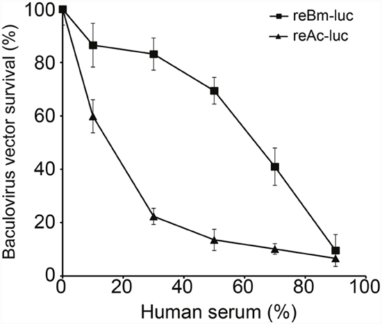 VERO cells were cultured in 6-well plates at a constant cell density of 1x106 cells per well. Human serum was pretreated as described [27]. Purified reBm-luc or reAc-luc vectors with an MOI of 100 in the infection assay were incubated with different concentrations of human serum at 37°C for 30 min, and then added to VERO cells for infection. Luciferase activity was measured 42 h later. The survival of the baculovirus vector was measured as the percentage of luciferase activity, which was compared with human serum heat-treated at 56°C as a control [27].