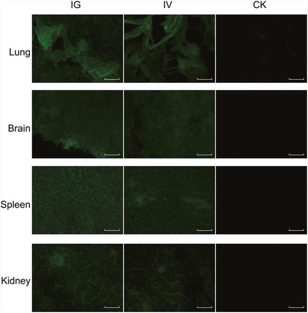 Figure 3: EGFP expression in mice. Abbreviations: IG, intragastric administration group; IV, intravenous injection group; CK, control group. Scale bar, 100 μm.