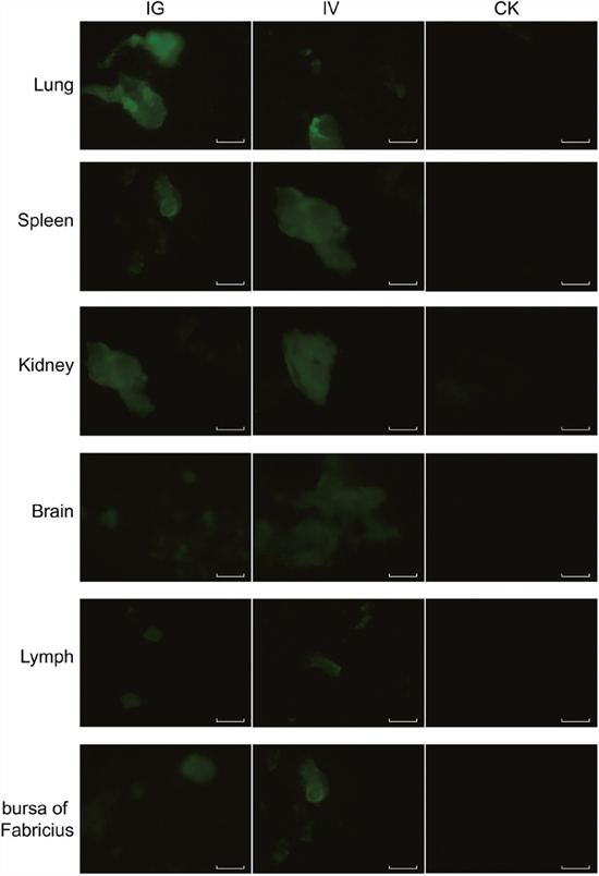 Figure 4: EGFP expression in chicks. Abbreviations: IG, intragastric administration group; IV, intravenous injection group; CK, control group. Scale bar, 100 μm.