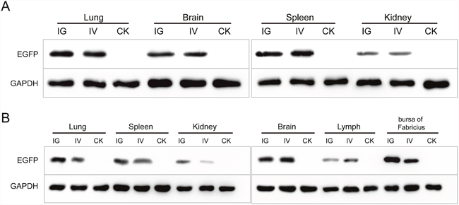 Figure 5: The Western blotting analysis of EGFP in mice (A) and chicks (B). Abbreviations: IG, intragastric administration group; IV, intravenous injection group; CK, control group.