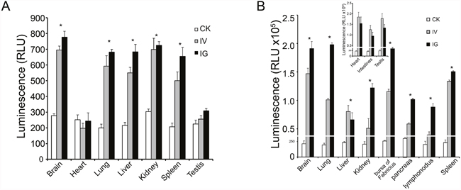Figure 6: Luciferase activity in vivo. (A) Luciferase activity was detected in mouse brain, lung, liver, kidney and spleen. (B) Luciferase activity was detected in most tissues in chicks. The expression efficiency in chicks was higher than in mice.