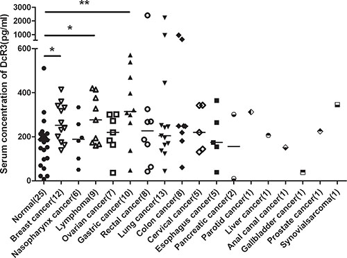 Figure 1: Serum DcR3 levels in cancer patients. DcR3 was significantly elevated in gastric cancer, lymphoma and breast cancer. Median DcR3 levels are indicated by short bars. The number of patients tested (n) is shown. *compared with healthy controls, P < 0.05. **compared with healthy controls, P < 0.01.