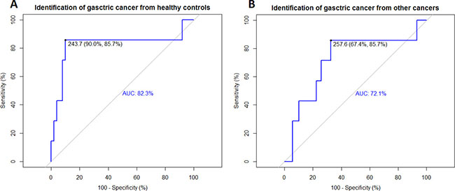 Figure 2: ROC curves revealed the diagnostic ability of DcR3 for gastric cancer. Identifications of gastric cancer from healthy controls and other cancers by DcR3 were evaluated using ROC curves. (A) Identification of gastric cancer from healthy controls using the ROC curve; sensitivity = 85.7%, specificity = 90.0%, AUC = 82.3%, threshold = 243.7 pg/mL; (B) Identification of gastric cancer from other cancers using the ROC curve; sensitivity = 85.7%, specificity = 67.4%, AUC = 72.1%, threshold = 257.6 pg/mL.