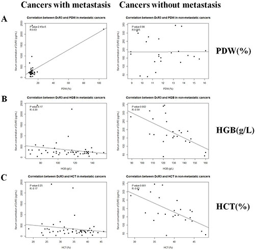 Figure 3: Correlations between serum DcR3 and hematological traits. Serum DcR3 level was associated with PDW, HGB and HCT. (A) Serum DcR3 level was positively correlated with PDW (R = 0.627, P = 2.45 × 10−6) in metastatic cancers while not correlated with PDW (R = 0.0049, P = 0.98) in non-metastatic cancers; (B) Serum DcR3 level was not correlated with HGB (R = −0.20, P = 0.17) in metastatic cancers while negatively correlated with HGB (R = −0.59, P = 0.002) in non-metastatic cancers; (C) Serum DcR3 level was not correlated with HCT (R = −0.17, P = 0.25) in metastatic cancers while negatively correlated with HCT (R = −0.62, P = 0.001) in non-metastatic cancers.