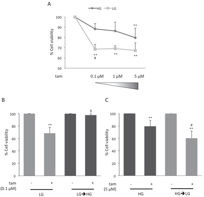 Figure 1: Effect of glucose on MCF7 cell responsiveness to tamoxifen. (A) MCF7 cells grown in high glucose (25mM; HG) or in low glucose (5.5mM; LG), were treated with estradiol (100nM; E2) and raising concentration (0.1μM, 1μM, 5μM) of tamoxifen (tam); (B) LG cells were shifted to high glucose (LG→HG) during the treatment with E2 and 0.1μM tam; (C) HG cells were shifted in low glucose (HG→LG) when treated with E2and 5μM tam. For all the panels (A), (B) and (C), cell viability was assessed, after four days, by sulforhodamine B assay (see Methods). The results were reported as percentage of viable cells compared to positive control (cells treated with E2 alone), considered as maximum viability (100%). Data represent the mean ± SD of at least three independent triplicate experiments. * denote statistically significant values compared with positive control (**p<0.01); § denote statistically significant values compared with tam treatment in LG cells (§p<0.01). # denote statistically significant values compared with tam treatment in HG cells (#p<0.05). See also Supplementary Figure 1.