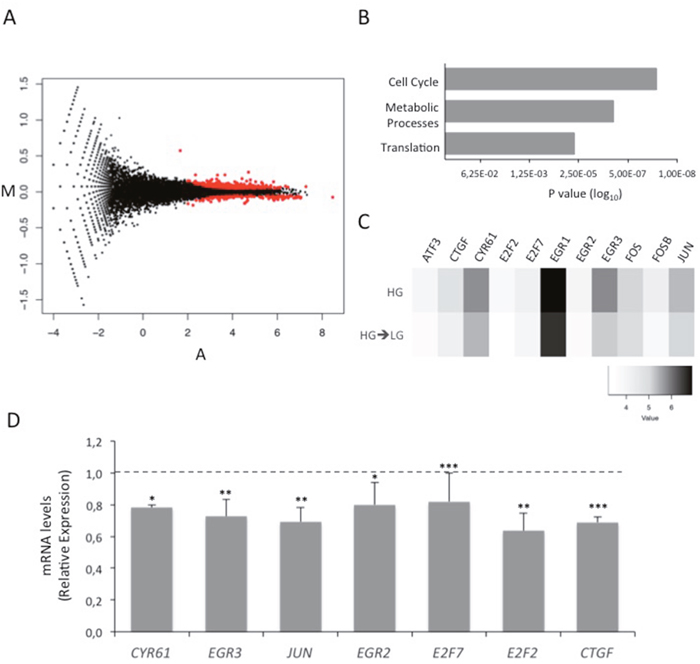 Figure 2: Effect of glucose on MCF7 cell transcriptome. (A) Standard MA plot (M, log ratios and A, mean average) of normalized (upper quartile) RNA-Seq data for each RefSeq gene. The y-axis reports logFC (fold-change), the x-axis the average log intensity (A) for each gene (indicated as dots). Red dots indicate genes that differentially expressed (P≥0.8) in the HG vs HG->LG comparison. (B) Bar graph showing the most significant gene pathways enriched with DEGs after the shift of MCF7 cells from high glucose (25mM; HG) to low glucose (5.5mM; HG→LG). (C) Heatmap of log-transformed normalized gene expression values for a small subset of highly significant deregulated genes belonging to “Cell cycle” pathway. (D) MCF7 cells grown HG (dotted line) were shifted in LG (HG→LG) during the treatment with estradiol (100nM; E2). After four days, mRNA expression levels of “Cell cycle” DEGs were determined by qRealTime-PCR (see Methods and Table 1). Data were normalized on Hypoxanthine Guanine Phosphoribosyl Transferase (HPRT) gene as internal standard. Bars represent the mean ± SD of three independent triplicate experiments and show the mRNA levels of DEGs in HG→LG cells relative to those in HG cells. * denote statistically significant values (*p<0.05, **p<0.01, ***p<0.001). See also Supplementary Figure 1.