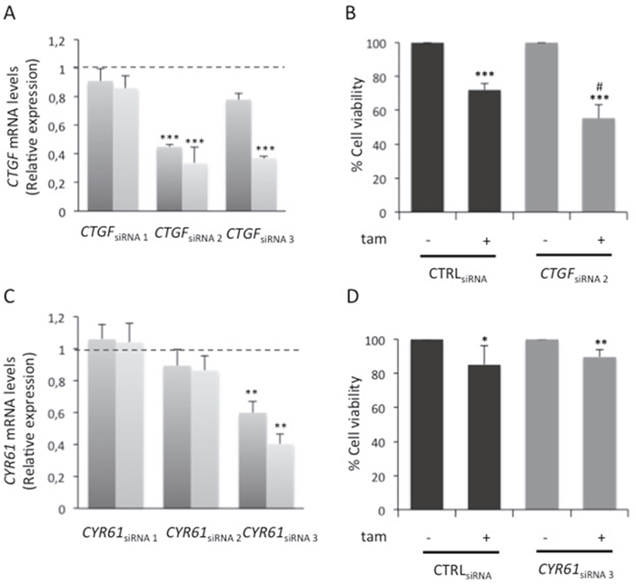 Figure 3: Role of glucose-induced CTGF on HG cell responsiveness to tamoxifen. (A) MCF7 cells cultured in high glucose medium (25mM; HG) were transfected (see Methods) with three different siRNAs recognizing CTGF (10nM; CTGFsiRNA) or with a control siRNA (10nM; CTRLsiRNA); (C) HG cells were transfected with three different siRNAs recognizing CYR61 (1nM; CYR61siRNA cells) or with a control siRNA (1nM; CTRLsiRNA). For both panels (A) and (C), after 6 hours, the cells were feed with complete medium and incubated for further 24 or 48 hours. The efficiency of siRNAs activity was assessed by qRealTime-PCR, as described in Methods. Data were normalized on Hypoxanthine Guanine Phosphoribosyl Transferase (HPRT) gene as internal standard. Bars represent the mean ± SD of three independent triplicate experiments and show the mRNA expression levels of (A) CTGF in CTGFsiRNA cells and (C) CYR61 in CYR61siRNA cells, both relative to those in CTRLsiRNA cells (dotted line), after 24 (dark grey columns) and 48 hours (light grey columns) transfection. * denote statistically significant values (**p<0.01; ***p<0.001). (B) HG cells transfected with selected CTGF siRNA (CTGFsiRNA 2) or with control siRNA (CTRLsiRNA) were treated with E2 (100nM) and tam (5μM); (D) HG cells transfected with selected CYR61 siRNA (CYR61siRNA 3) and with control siRNA (CTRLsiRNA) were treated with E2 and tam (5μM). For both panels (B) and (D), as positive control, the cells were treated with E2 alone. After 24 hours, cell viability was determined, by sulforhodamine B assay (see Methods). The results were reported as percentage of viable cells compared with positive control considered as 100% viability. Data represent the mean ± SD of three independent triplicate experiments. * denote statistically significant values compared with positive control (*p<0.05, **p<0.01, ***p<0.001); # denote statistically significant values compared with tam treatment in CTRLsiRNA cells (#p<0.01).