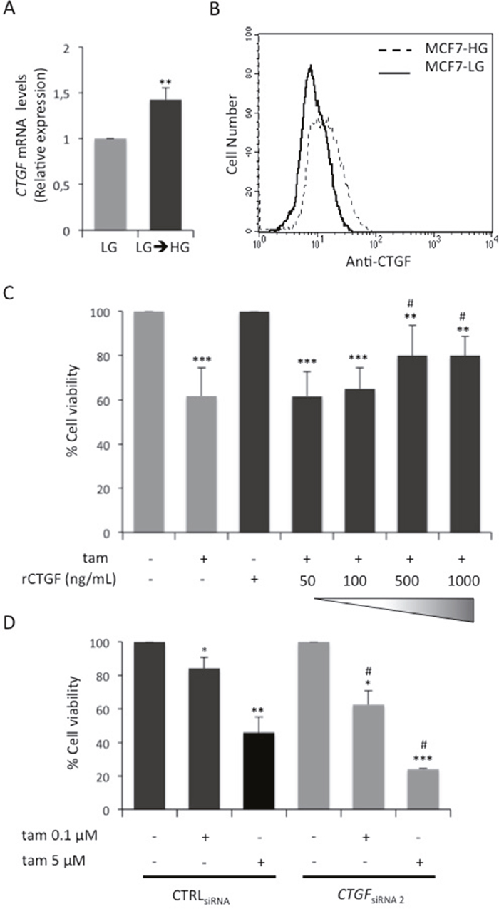 Figure 4: Role of glucose-induced CTGF on LG cell responsiveness to tamoxifen. (A) MCF7 cells grown in low glucose medium (5.5mM; LG) were shifted in high glucose medium (LG→HG) during the treatment with E2 (100nM). After four days, mRNA expression levels of CTGF were determined by qRealTime-PCR (see Methods). Data were normalized on HPRT gene as internal standard. Bars represent the mean ± SD of three independent triplicate experiments and show the mRNA levels of CTGF in LG→HG cells relative to those in LG cells. * denote statistically significant values (**p<0.01). (B) CTGF protein levels in MCF7 chronically exposed to high (HG 25mM - dotted line) or low (LG 5.5mM - solid line) glucose concentrations. One representative experiment is shown. (C) LG cells were treated with E2 and tam (5μM) in presence or absence of human recombinant CTGF protein at increasing doses (50 ng/mL, 100 ng/mL, 500 ng/mL, 1000 ng/mL; rCTGF). As positive control, the cells were treated with E2 alone. After 4 days, cell viability was assessed by sulforhodamine B assay, as described in Methods. The results were reported as percentage of viable cells compared with positive control, considered as 100% viable cells. Data represent the mean ± SD of three independent triplicate experiments. * denote statistically significant values compared with positive control (**p<0.01;***p<0.001); # denote statistically significant values compared with tam treatment in untreated cells (#p<0.05). See also Supplementary Figure 1. (D) LG cells transfected with selected CTGF siRNA (CTGFsiRNA 2) or with control siRNA (CTRLsiRNA) were treated with E2 (100nM) and tam (0.1μM and 5μM). As positive control, the cells were treated with E2 alone. After 24 hours, cell viability was determined, by sulforhodamine B assay (see Methods). The results were reported as percentage of viable cells compared with positive control considered as 100% viability. Data represent the mean ± SD of three independent triplicate experiments. * denote statistically significant values compared with positive control (*p<0.05, **p<0.01, ***p<0.001); # denote statistically significant values compared with tam treatment in CTRLsiRNA cells (#p<0.01).