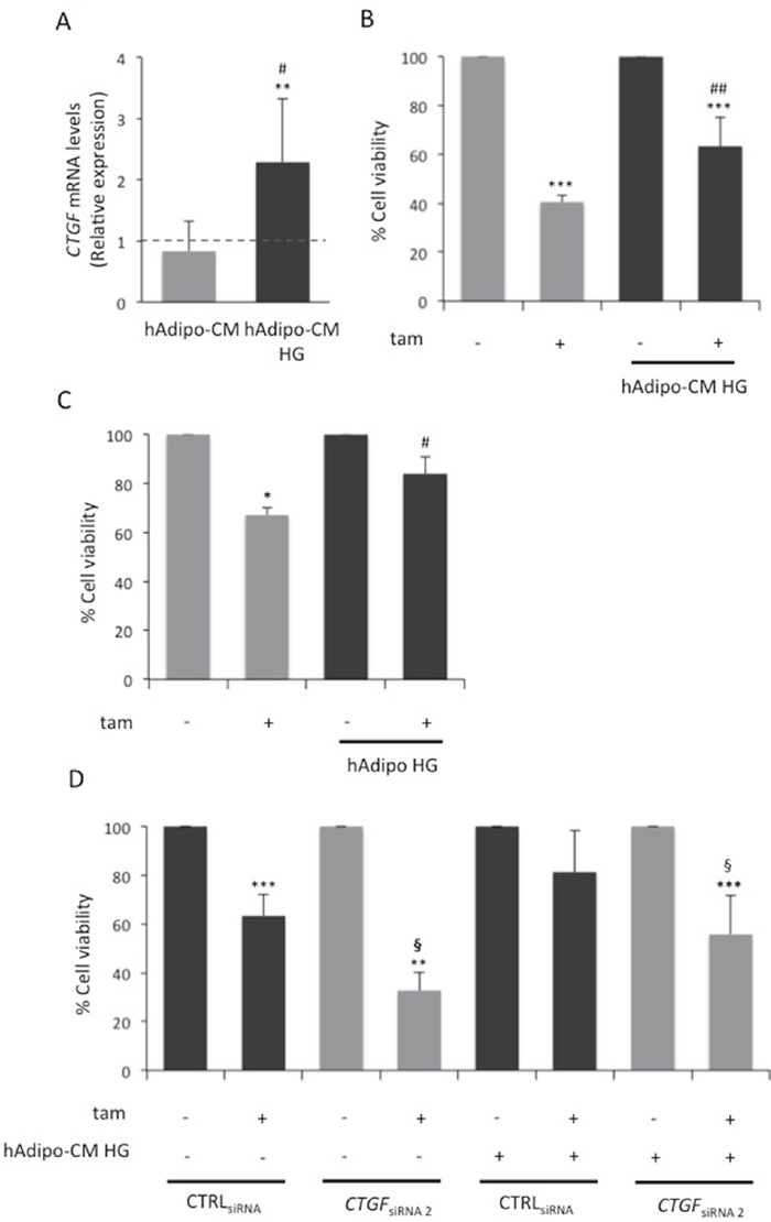Figure 5: Role of CTGF in glucose-induced adipocyte-effect on MCF7 responsiveness to tamoxifen. (A) Mature adipocytes, cultured in 15mM glucose, were incubated in serum free high glucose medium (25 mM; HG). After 8 hours, media were collected - from adipocytes pre-incubated or not in HG (hAdipo-CM and HG hAdipo-CM, respectively) - and applied onto MCF7 cells. As control, the cells were incubated in serum-free medium (15mM and 25mM, respectively). After four days, CTGF mRNA expression levels were determined by qRealTime-PCR, as described in Methods. Data were normalized on Hypoxanthine Guanine Phosphoribosyl Transferase (HPRT) gene as internal standard. Bars represent the mean ± SD of three independent triplicate experiments and show the expression levels of CTGF in cells treated with conditioned media relative to those in untreated cells (dotted line). * denote statistically significant values compared with positive control (**p<0.01); # denote statistically significant values compared with cells treated with hAdipo-CM (#p<0.05). (B) MCF7 cells were treated with estradiol (100nM; E2) and tamoxifen (5μM; tam) in presence of HG hAdipo-CM or in absence of it (in serum-free HG medium). As positive control, the cells were treated with E2 alone. After 4 days, cell viability was determined by sulforhodamine B assay, as described in Methods. (C) MCF7 cells were seeded in the upper chamber of a transwell system with or without mature adipocytes in the lower chamber. MCF7 cells were treated with E2 and tam (5μM) in serum free HG medium. As positive control, the cells were treated with E2 alone. After 24 hours, cell viability was assessed by crystal violet, as described in Methods. (D) MCF7 cells transfected (see Methods) with selected siRNAs recognizing CTGF (10nM; CTGFsiRNA 2) or with a control siRNA (10nM; CTRLsiRNA) were treated with E2 (100nM) and tam (5μM) in presence or absence of HG hAdipo-CM. As positive control, the cells were treated with E2 alone. After 24 hours, cell viability was assessed by sulforhodamine B assay, as described in Methods. For the panels (B), (C) and (D), the results were reported as percentage of viable cells compared with positive control, considered as 100% viable cells. Data represent the mean ± SD of three independent triplicate experiments. * denote statistically significant values compared with positive control (*p<0.05; ***p<0.001); # denote statistically significant values compared with tam treatment in absence of (B) hAdipo-CM, (C) adipocytes (#p<0.05; ##p<0.01); § denote statistically significant values compared with tam treatment in CTRLsiRNA cells (§p<0.05).