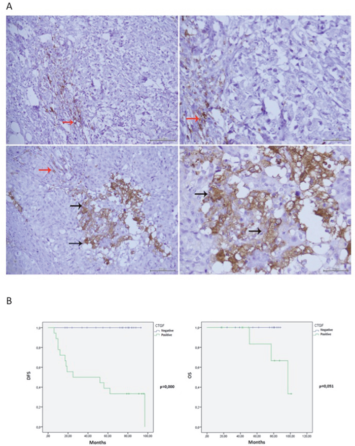 Figure 7: CTGF IHC staining in ER+ breast cancer tissues and Kaplan-Meier curves. (A) Negative staining of CTGF in cancer cells at 20x and 40x magnification (Upper panels, respectively). Positive staining of CTGF in cancer cells (black arrows) at 20x and 40x magnification (Lower panels, respectively). Details of inflammatory cells CTGF staining (red arrows) represented positive internal control. (B) Kaplan-Meier curves representing overall survival (OS) and disease-free survival (DFS), have been calculated as described in Experimental Procedures. The follow-up duration was five years. Patients which stained positive for CTGF were reported as Green line; patients which stained negative as blue line.
