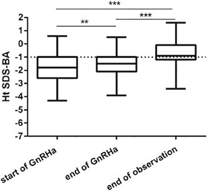 Ht-BA SDS gradually increased during the treatment(P<0.001). This was significantly increased at end of treatment than that at start of treatment (P<0.01), and Ht-BA SDS was significantly increased at end of observation than that at end of treatment (P<0.001), Figure 2.