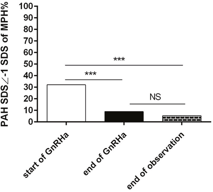 Since the enrolled patients may not came from the balanced cohort, we took another marker to access whether GnRHa could increase the height gain as PAH SDS based on MPH. We used PAH below -1SDS of MPH as no-reaching their normal height. The percentage of patients whose height did not reach the value of -1MPHSDS was significantly higher at start of treatment (32.14%) than that at end of treatment (8.92%, P<0.001) and at end of observation (5.36%, P<0.001), and the difference between the end of treatment and the end of observation was not statistically significant (P>0.05), Figure 3. This also means that GnRHa therapy can achieve adult height. Figure 3.