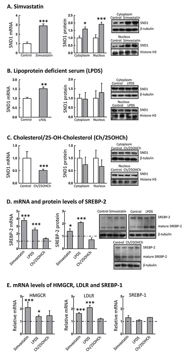 Figure 1: SND1 gene transcription responds to SREBP-2 activity modulators. The SND1 transcript level and the SND1 protein content in nuclei and the cytoplasmic fraction were quantified in control HepG2 cells (white bars) and cells cultured during 24 h with 10 μM simvastatin (A), or in a lipoprotein deficient (LPDS) medium (B), or in the presence of 10 μg/ml cholesterol plus 1 μg/ml 25-hydroxycholesterol (Ch/25OHCh) (C) (dark bars). Aliquots of cells (7 x105 cells) were subjected to RNA isolation and first strand cDNA was synthesized and used as the template for individual PCR reactions using the primers listed in Supplementary Table 1. Other aliquots (7 x105 cells) were processed for the isolation of nucleus and cytoplasm and subjected to immunoblot analysis for SND1 and normalized with histone H3 and β-tubulin, respectively. The precursor (SREBP-2) and mature SREBP-2 protein content (D) and the HMGCR, LDLR and SREBP-1 transcript levels (E) were also determined in cells treated as above, and are expressed relative to the level in control cells, which is shown as a grey grid line. Results are reported as the mean ± SD of 3-5 independent experiments, each performed in triplicate (duplicate in western blotting), and were analyzed by the two-tailed Student’s t-test. * p≤0.05, ** p≤0.01 and *** p≤0.001 denote the effect of treatment.