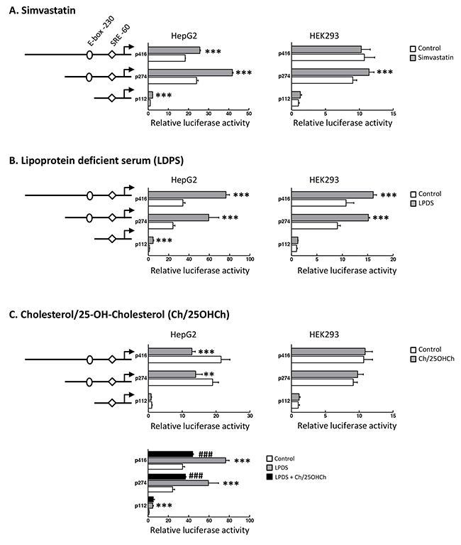 Figure 2: Transcriptional activity of SND1 proximal promoter responds to SREBP-2 activity modulators. SND1 transcriptional activity was measured in HepG2 and HEK293 cells (10 x103) transiently transfected with SND1 promoter constructs p112, p274 or p416 covering the promoter sequence (-112, +221) or (-274, +221) or (-416, +221) cloned in pGL3-Basic vector as described in Material and methods and cultured during 24 h with 10 μM simvastatin (A), or in a lipoprotein deficient (LPDS) medium (B), or in the presence of 10 μg/ml cholesterol plus 1 μg/ml 25-hydroxycholesterol (Ch/25OHCh) (C) (dark bars). Promoter activity is represented as luciferase arbitrary units relative to its corresponding control, untreated p112 fragment. Results are reported as the mean ± SD of 3-5 independent experiments, each performed in quadruplicate and were analyzed by the two-tailed Student’s t-test. ** p≤0.01 and *** p≤0.001 denote the effect of treatment, ###p≤0.001 denotes the effect of Ch/25OHCh+LPDS versus LPDS alone.