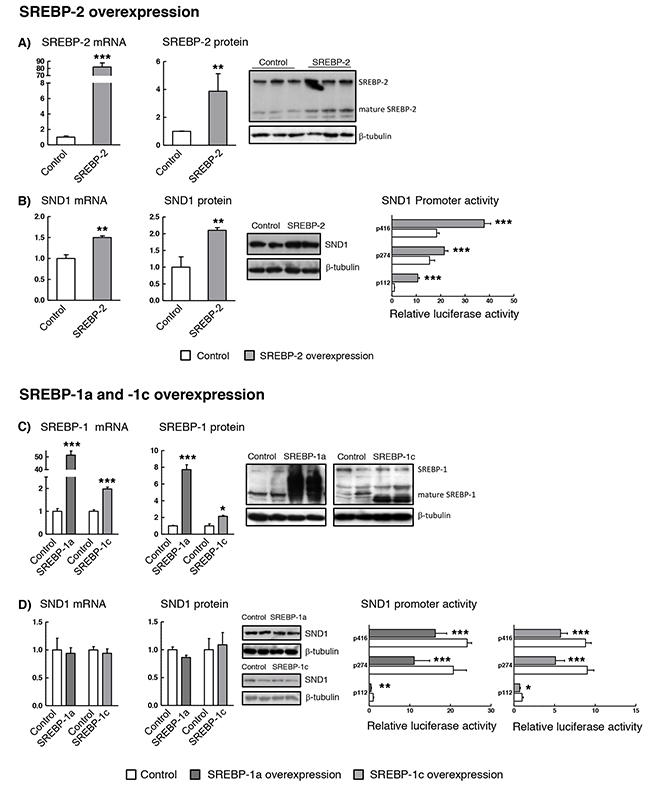 Figure 4: SND1 gene transcription is dependent on the cellular SREBP levels. HepG2 cells were transfected with expression plasmids of human SREBP-2 (A and B) or SREBP-1a or SREBP-1c (C and D). After 24h, (A and C) SREBPs and (B and D) SND1 transcript and protein levels and SND1 gene promoter activity were determined as described in Material and methods. Transcript and protein levels are expressed relative to the level in control cells. Promoter activity is expressed as luciferase arbitrary units relative to its corresponding p112 control. Results are reported as the mean ± SD of 3 independent experiments, each performed in quadruplicate (triplicate or duplicate in western blotting), and were analyzed by the two-tailed Student’s t-test. Significance is denoted: * p≤0.05, ** p≤0.01 and *** p≤0.001 versus control cells.