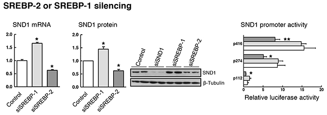Collectively, these findings evidence that SND1 transcription is controlled by SREBPs and the binding of SREBP-2 and/or SREBP-1 to specific sites in the gene promoter might ensue opposite responses of SND1 gene expression, at least in the hepatic HepG2 cell context.