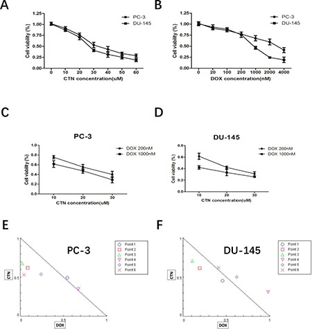 Figure 1: Treatment with costunolide or doxorubicin alone or combined two agents on cell proliferation of PC-3 and DU-145. (A) Inhibitory effect of costunolide treatment for 24 h. (B) Inhibitory effect of doxorubicin treatment for 24 h. Additionally, PC-3 (C) and DU-145 (D) cells were also exposed to different doses of costunolide that combine with 200 nM or 1000 nM doxorubicin. Combination index (CI) among the combinations of two drugs in PC-3 (E) and DU-145 (F) cells were calculated using CompuSyn software. If CI > 1, it denoted antagonism; if CI < 1, it denoted synergism. Here, points 1: CTN:10 μM + DOX:200 nM; 2: CTN:20 μM + DOX:200 nM; 3: CTN:30 μM + DOX:200 nM; 4: CTN:10 μM + DOX:1000 nM; 5: CTN:20 μM + DOX:1000 nM and 6: CTN:30 μM + DOX:1000 nM. Results were presented as the median of three independent experiments.