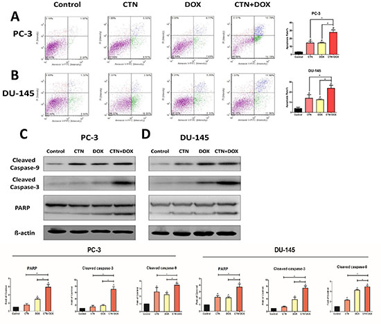 Figure 2: Costunolide enhanced doxorubicin to induce apoptosis in PC-3 and DU-145 cells. PC-3 and DU-145 cells were treated with 20 μM costunolide, 200 nM doxorubicin, or both for 24 h. Costunolide enhanced doxorubicin to induce apoptosis in PC-3 (A) and DU-145 (B) cells detected by using annexin V-APC kit and PI staining. Bar charts showed quantitative data of average of 3 independent experiments in PC-3 and DU-145 cells. Western blots and quantitative analyses were performed to determine cleave caspase-9, cleave caspase-3 and PARP proteins expression in PC-3 (C) and DU-145 (D) cells after treatment. β-actin was used as a loading control. Results were presented as the mean ± SD of three independent experiments. *p < 0.05; #p < 0.05 compared with the control group.