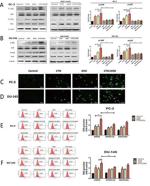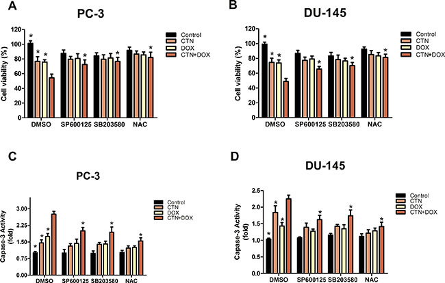 Figure 4: Costunolide enhanced the cytotoxic effect of doxorubicin via activated the p38, JNK pathways and ROS in PC-3 and DU-145 cells. PC-3 and DU-145 cells were treated with 20 μM costunolide, 200 nM doxorubicin, or both in the absence or presence ROS scavenger (NAC, 5 mM), JNK inhibitor (SP600125, 10 μM) and P38 inhibitor (SB203580. 10 μM). Using CCK-8 assay to detect the cell viability in PC-3 (A) and DU-145 (B) cells, we found that percentage of survived cells in the CTN + DOX group statistically significant decrease (*p < 0.05, compared with CTN + DOX group), but this observation was reversed significantly when we added the JNK inhibitor (SP600125), P38 inhibitor (SB203580), ROS scavenger (NAC) to the CTN + DOX group (*p < 0.05, compared with CTN + DOX group). Using the caspase-3 activity assay kit to detect the apoptosis in PC-3 (C) and DU-145 (D) cells, we found that caspase-3 activity increased significantly in the CTN + DOX group compared with either agent alone group (*p < 0.05, compared with CTN + DOX group), but this observation was reversed significantly when we added the JNK inhibitor (SP600125), P38 inhibitor (SB203580), ROS scavenger (NAC) to the CTN + DOX. (*p < 0.05, compared with CTN + DOX group). Data presented as mean ± SD were representative of three independent experiments.