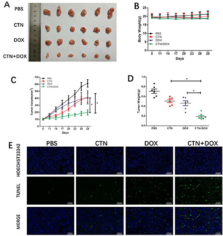 Figure 6: Costunolide enhanced doxorubicin to inhibit PC-3 tumor growth in athymic nude mice via induction of apoptosis. Nude mice inoculated with PC3 cells were treated with costunolide, doxorubicin alone or combined two agents. (A) Tumors were photographed at the end of treatment (Day 21). (B) Mouse body weights were monitored every three days for three weeks till the end of treatment (Day 21). (C) Tumor growth curves based on tumor volumes measured every three days and (D) weights recorded at the end of treatment (Day 21) (*p < 0.05). (E) Tumor tissues were examined by TUNEL assay (100×). Scale bar was 100 μm.