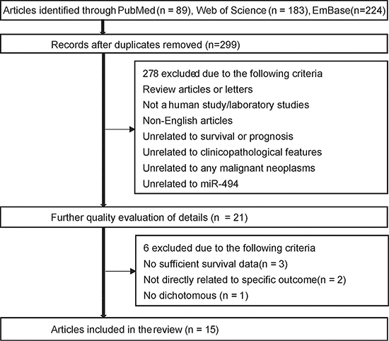 We comprehensively searched Embase, PubMed, Web of Science databases from 1966 to April 1st, 2017.The literature was published during the period of time, grey literature was not found during our meta-analysis. The keywords employed in searching were “mir-494 OR microrna-494 OR mirna-494 OR hsa-mir-494” AND “tumor OR cancer OR carcinoma OR neoplasm”. To get some raw data which was not mentioned in the articles, we contacted some of the authors to get a more accurate result. Relevant references of review articles about miR-494 were also searched by hand and carefully read by us to obtain more studies. In addition, we separately conducted the search and articles inclusion based on a common set of criteria, and we settled our divergence in opinion by discussion among ourselves.