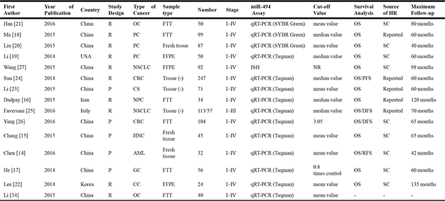 Abbreviations: miR-494,microRNA-494; HR ,Hazard Ratio; NR, not reported; q-PCR, quantitative real-time polymerase chain reaction; OS, overall survival; PC, pancreatic cancer; OC, ovarian cancer; NSCLC, non-small lung cancer; CRC, colorectal carcinoma; AML, Acute myeloid leukemia; NPC, nasopharyngeal carcinoma. GC, gastric cancer. CC, cervical cancer. EOC, Epithelial ovarian cancer. HNSCC, Head and neck squamous cell carcinoma. CS, chondrosarcoma. ISH, in situ hybridization. SC, survival cur. PFS, progress free survival. DFS, disease free survival. RFS, recurrence free survival. FFPE, formalin-fixed paraffin-embedded. FTT, Frozen tumor tissue. -, not mentioned.