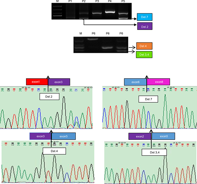 Analysis of ERα mRNA transcripts in samples of human endometrium, both with and without endometriosis, are presented in Figure 1. In addition to wild-type (wt) ERα mRNA, we successfully detected the mRNA of four different types of splice variant in the human endometrium. These represent splice variants lacked exon 2 (Del.2), lacking exon 4 (Del.4), exon 7 (Del.7) and exons 3 and 4 (Figure 2A, 2B).