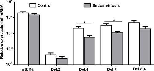 Figure 3: Expression of wt- ERα, ERαDel.2, ERαDel.4, ERαDel.7 and ERαDel.3, 4 in human endometrium in the total sample population (n = 58 patients) without taking into account the phase of the menstrual cycle or the existence of endometriosis. Data from three to six experiments are expressed on a logarithmic scale in relation to GAPDH and ß-actin mRNA levels (mean ± standard deviation). *p < 0.05, **p < 0.01 in comparison with wt-ERa.