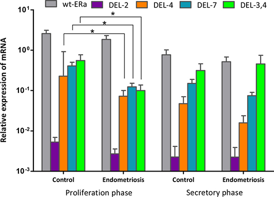When the phase of the menstrual cycle was disregarded, there was a significantly diminished expression of Del.4 (P = 0.047) and Del.7 (P = 0.032) in the endometrium of patients with endometriosis compared with healthy endometrium. However, no significant difference was observed in terms of the expression of wt-ERα when compared between patients with and without endometriosis (Figure 4).