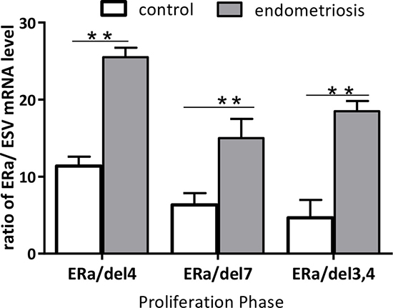 Figure 6: In the proliferative phase, the ratio of wt-ERα:ERα EL.4, wt-ERα:ERαDEL.7 and wt-ERα:ERαDEL.3,4 were significantly higher in endometriosis patients compared with the control group. Data from three to six experiments were pooled and the ration of wt-ERα and its respective splice variants are shown as mean values ± standard deviation. *p < 0.05, **p < 0.01.