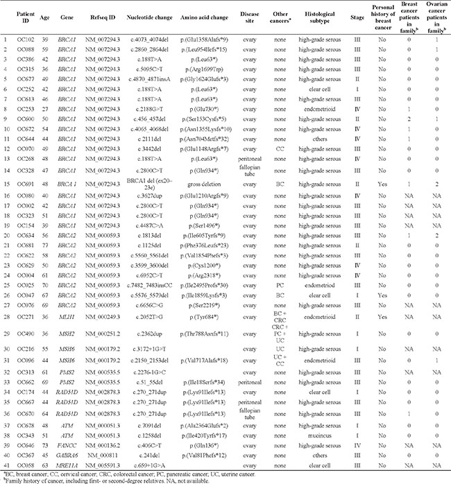 Accordingly, this study was conducted to determine the prevalence of pathogenic germline variants of OC-associated genes including known predisposing genes in an unselected group of 230 Japanese patients with OC, using next-generation sequencing (NGS)-based comprehensive targeted panel sequencing (TPS) for 75 or 79 candidate genes. The putative pathogenic variants were interpreted based on a database from Myriad Genetics [9] and a well-evaluated classification of variants in guidelines from the American College of Medical Genetics and Genomics (ACMG) [10].